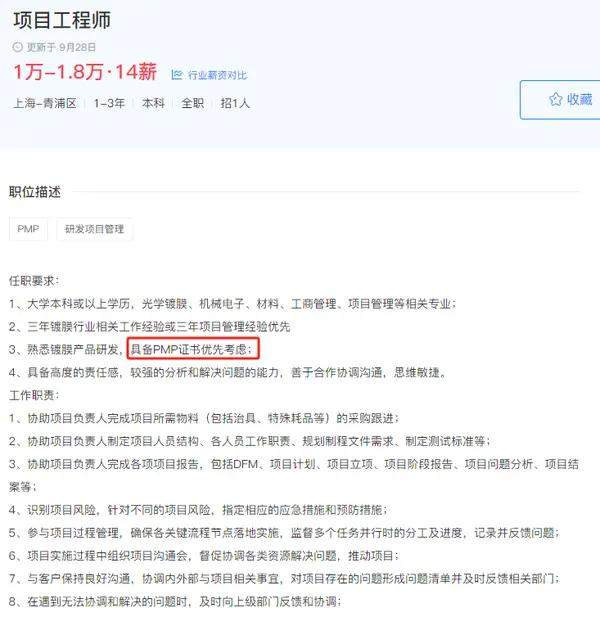 同樣,在許多招聘網(wǎng)站上,你也能看到很多跟項(xiàng)目相關(guān)的崗位,都會(huì)有具備PMP®證書優(yōu)先考慮的說(shuō)明:
